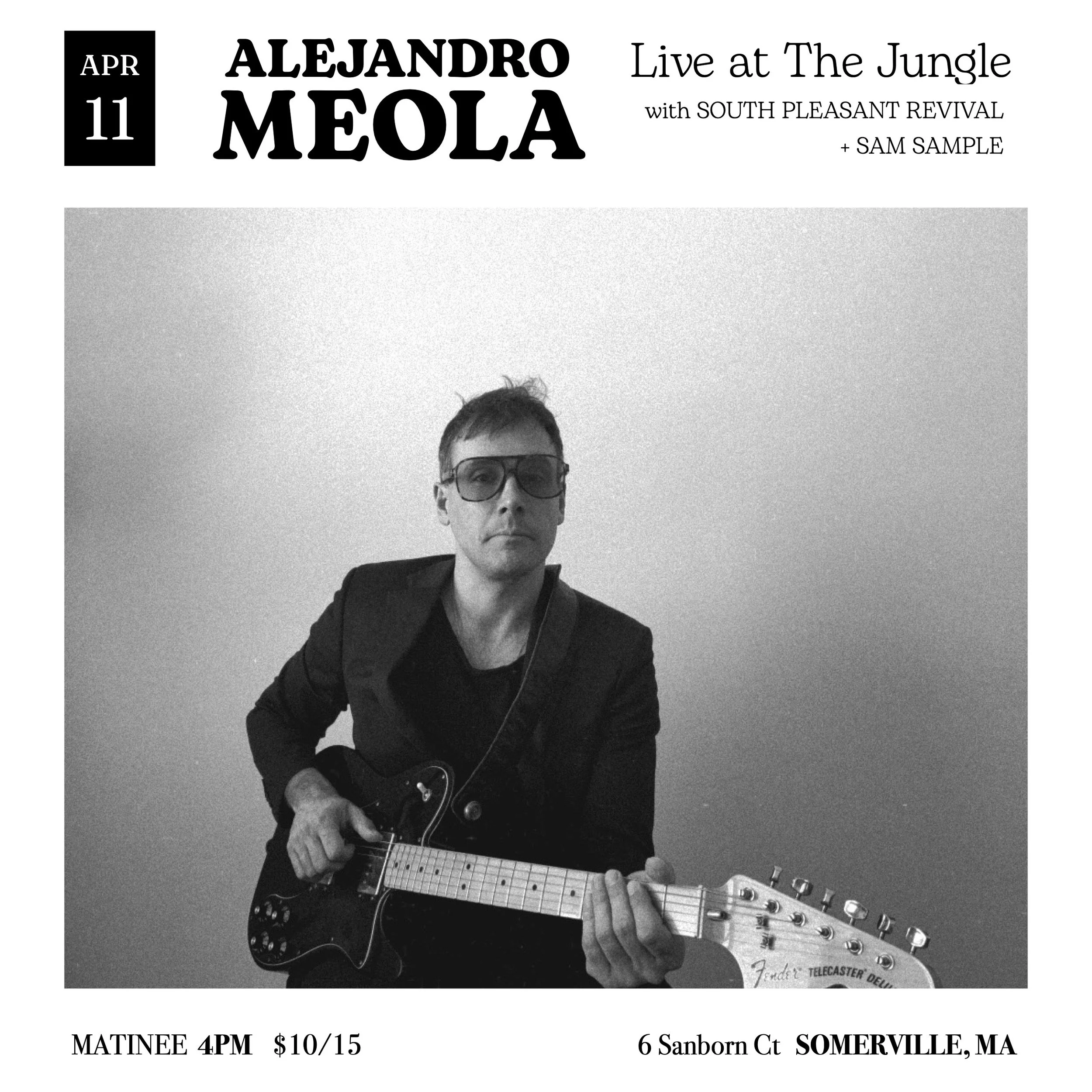 Sábado 11 de Abril Alejandro Meola en The Jungle - 6 Sanborn Ct, Somerville, MA, show de matinee a las 4pm junto a Sam Sample y South Pleasant Revival. Entradas anticipadas $10 a través de Eventbrite o $15 en la puerta el día del show. Compra tus boletos aquí