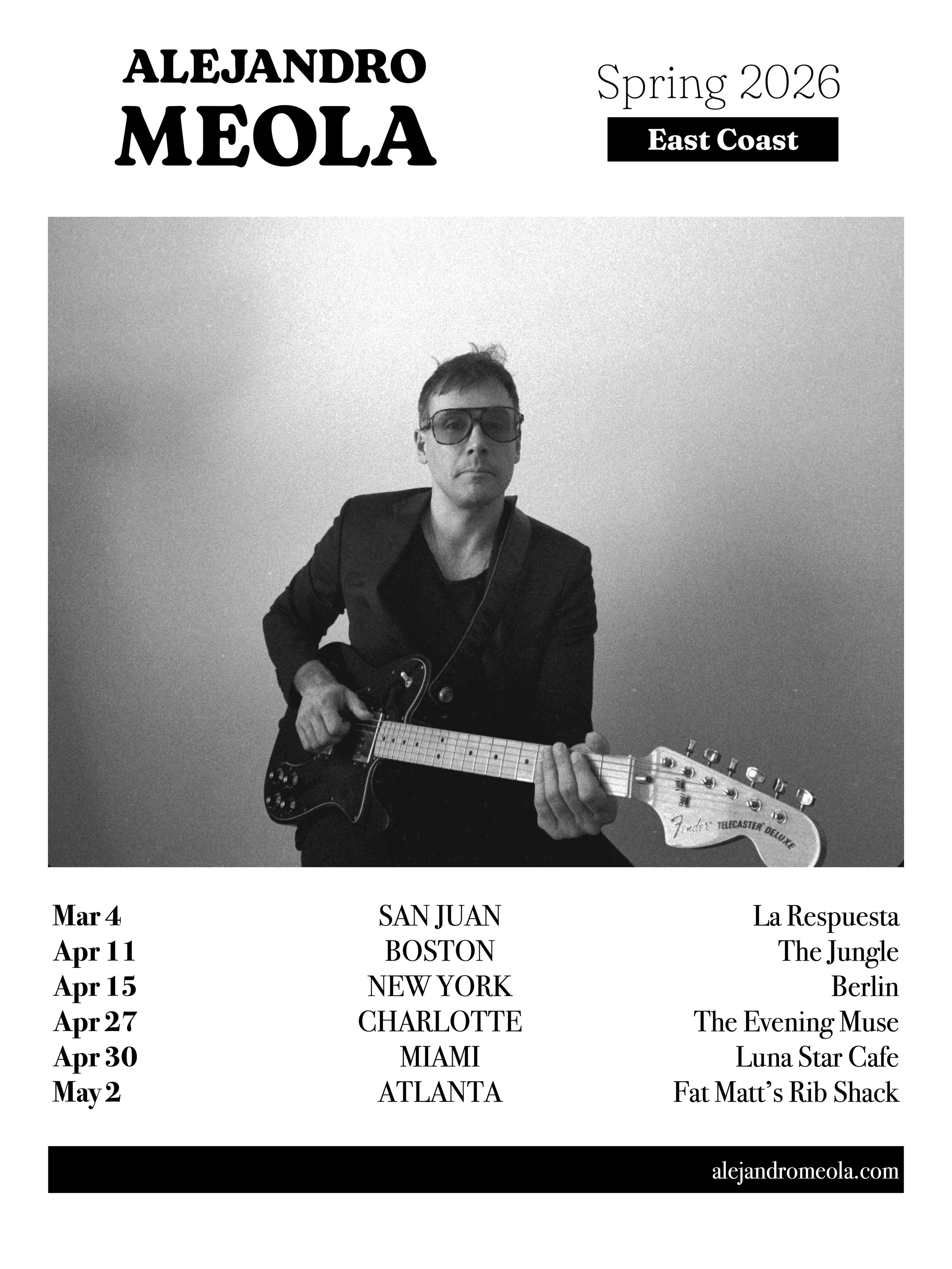 Alejandro Meola es un cantautor y guitarrista argentino-americano independiente radicado en el área de NYC desde 2013. Con raíces en el Rock, Blues, Folk fue incluido en la Best New Latinx playlist de NPR World Cafe y ha tocado por Estados Unidos, Europa y Latinoamérica en ciudades como Los Angeles, Chicago, Londres, Paris, Madrid, Mexico y Buenos Aires.